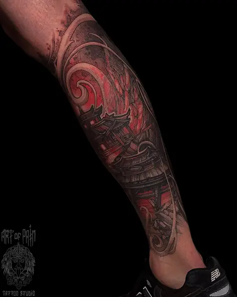 Татуировка мужская нео-япония на голени пагода (Денис Марченко) 7784