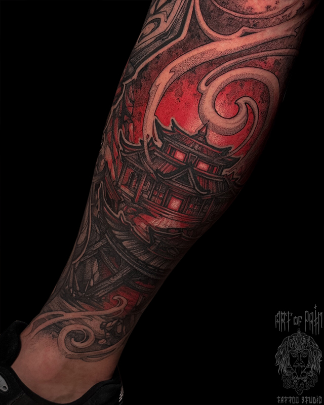 Татуировка мужская нео-япония на голени пагода (Денис Марченко) 7786