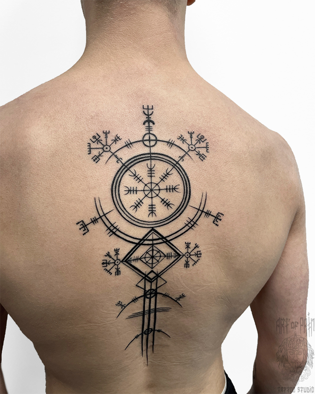 Татуировка мужская графика на спине орнамент 7824