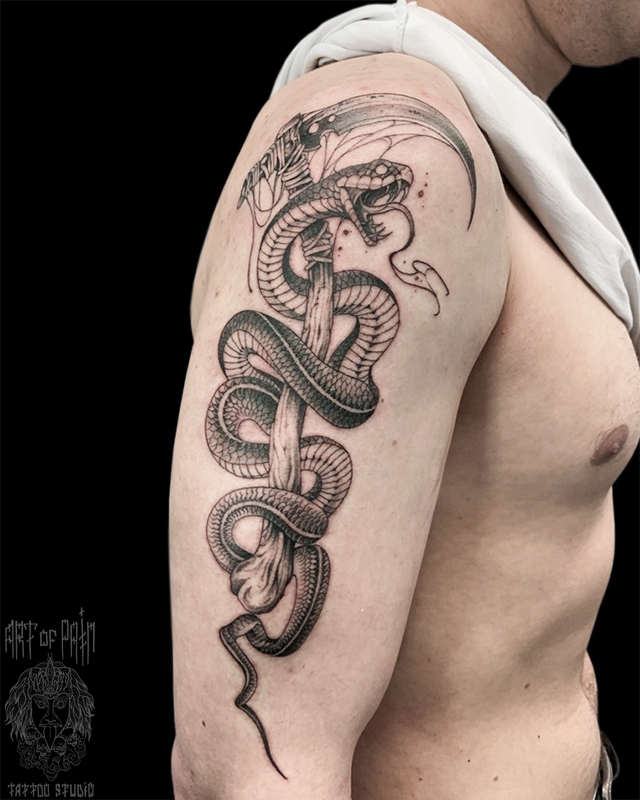 Татуировка мужская графика на плече змея 7838