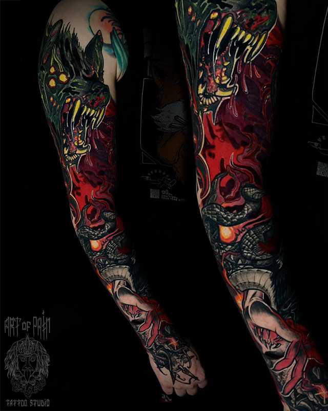 Татуировка мужская хоррор тату-рукав монстр и змея (Кирилл Плотников) 7887