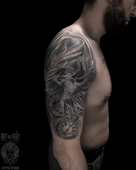 Татуировка мужская реализм на плече феникс и часы (Вячеслав Плеханов) 7894