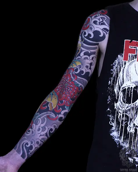 Татуировка мужская япония тату-рукав хризантемы и карп 7940