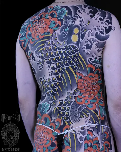 Татуировка мужская япония на спине карп и хризантемы 7947