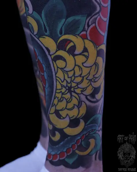 Татуировка мужская япония на голени змея и хризантема 7951
