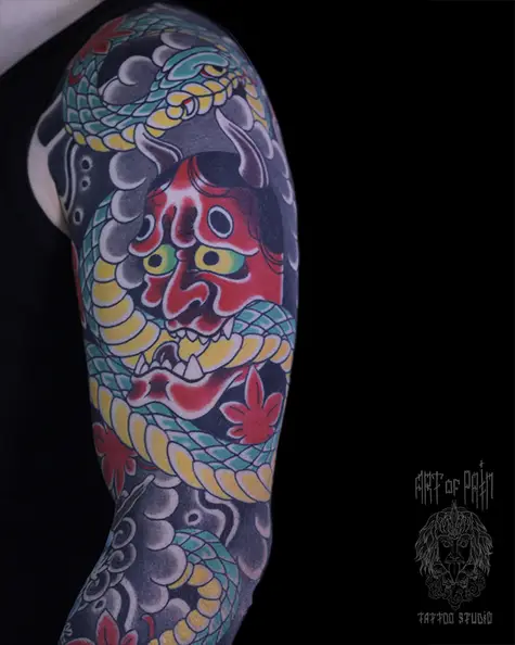 Татуировка мужская япония на плече демон и змея 7964