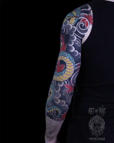 Татуировка мужская япония тату-рукав демон и змея 7966