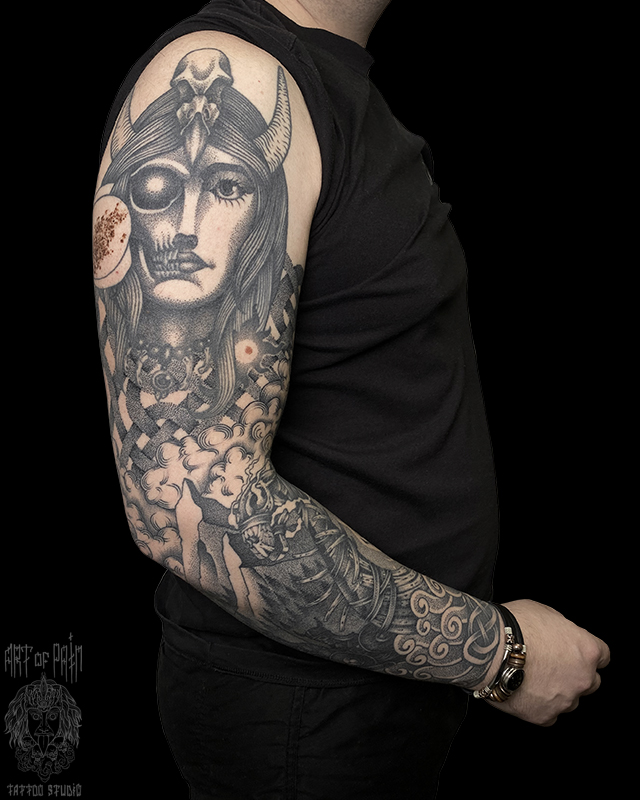 Татуировка мужская графика тату-рукав девушка, демон, орнамент (Николай Орф) 7982