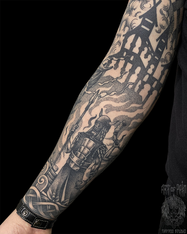 Татуировка мужская графика на предплечье призрак, скелет, демон, пожар (Николай Орф) 7983