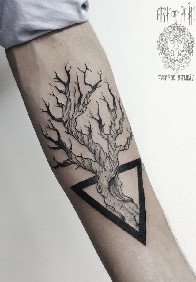 Татуировка мужская графика на предплечье дерево и треугольник 801
