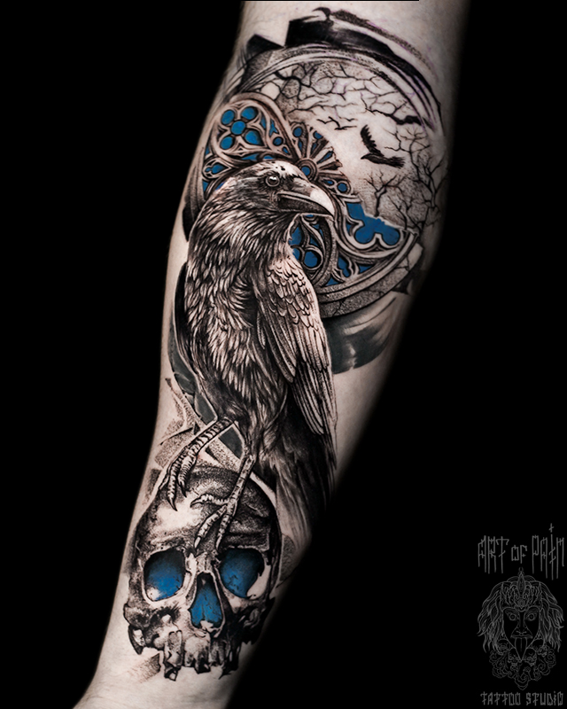 Татуировка мужская реализм на предплечье череп и ворон (Слава Tech Lunatic) 8040