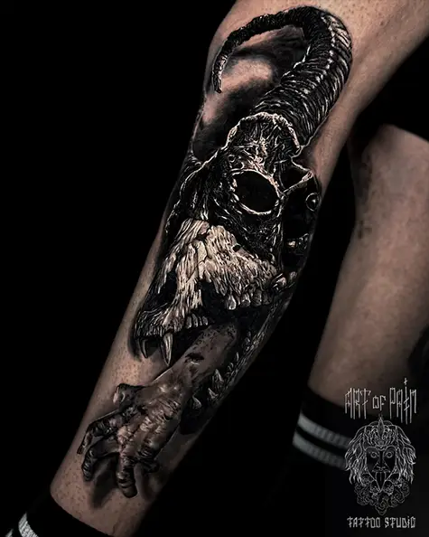 Татуировка мужская реализм, хоррор на голени череп и рука (Евгений Кузьменков) 8050