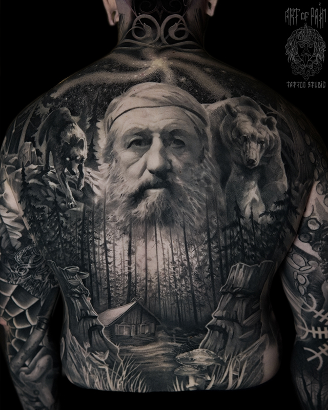 Татуировка мужская реализм на спине Добровольский (Александр Pusstattoo) 8051