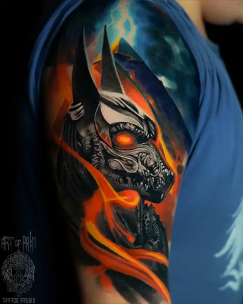 Татуировка мужская реализм и хоррор на плече Анубис 8058