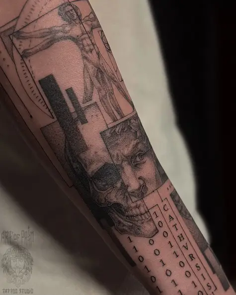 Татуировка мужская графика на предплечье человек Леонардо, Давид и череп (Денис Марченко) 8070