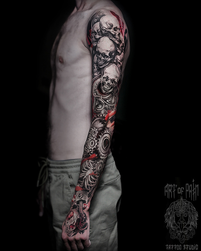 Татуировка мужская реализм и хоррор тату-рукав черепа и механизмы (Слава Tech Lunatic) 8243