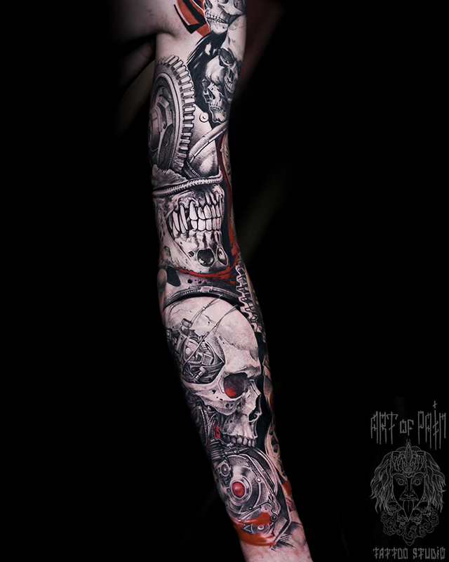Татуировка мужская реализм и хоррор тату-рукав черепа и механизмы (Слава Tech Lunatic) 8244