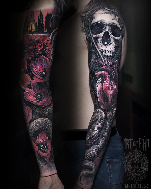 Татуировка мужская реализм и хоррор тау-рукав череп, маки, сердце, змея (Слава Tech Lunatic) 8245