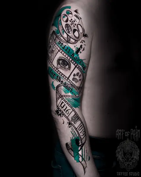 Татуировка мужская реализм тату-рукав кинолента, глаз, след (Слава Tech Lunatic) 8247