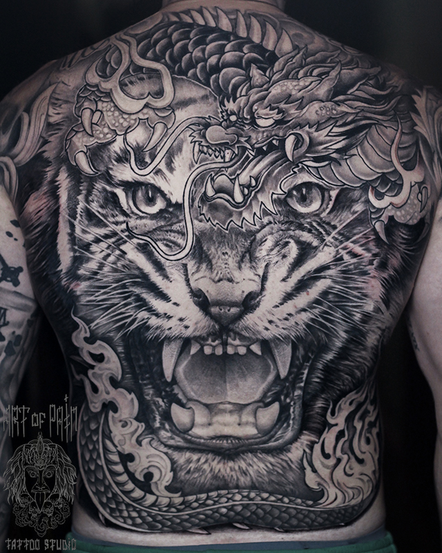 Татуировка мужская реализм и фэнтези на спине тигр и дракон (Слава Tech Lunatic) 8248