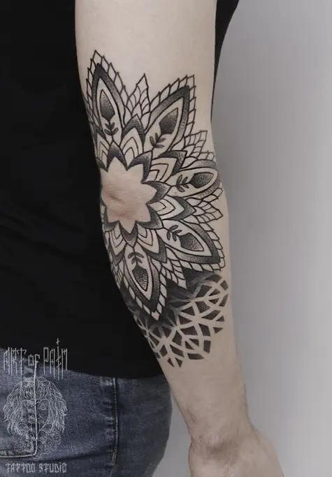 Татуировка женскаямужская графика на локте мандала 828