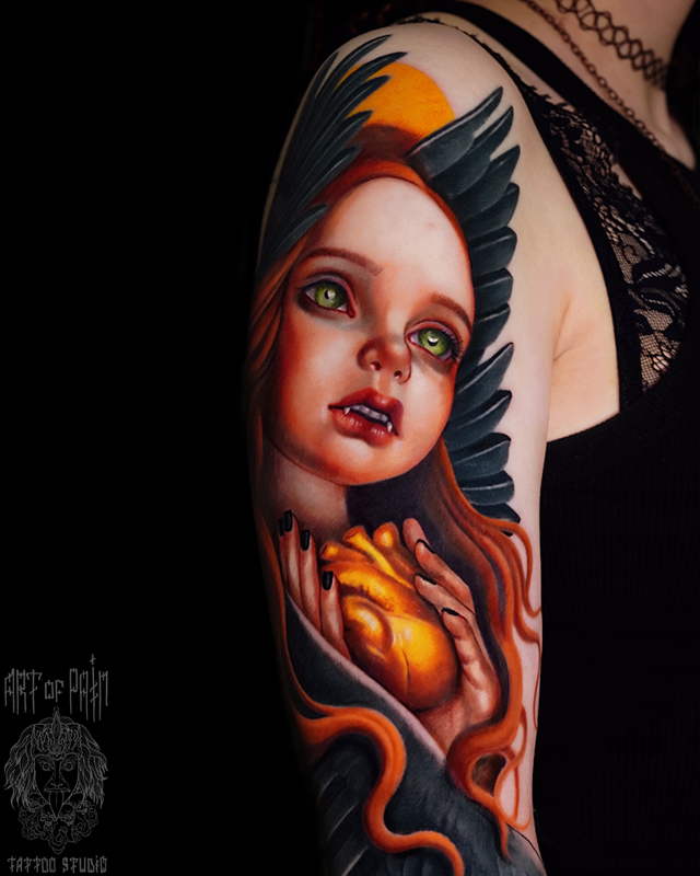 Татуировка мужская цветной реализм на плече девочка вампир с сердцем (Анастасия Юсупова) 8280