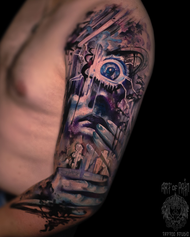 Татуировка мужская хоррор на плече девушка и глаз (Дмитрий Шейб) 8296
