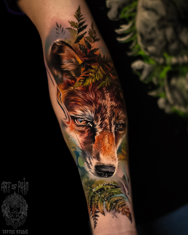 Татуировка мужская цветной реализм на предплечье лис (Дмитрий Шейб) 8309