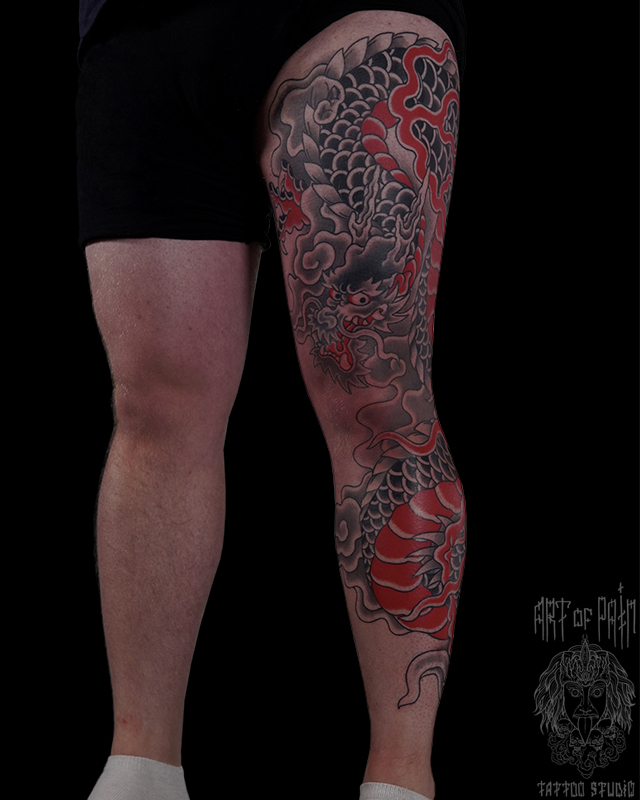 Татуировка мужская япония на ноге дракон 8324
