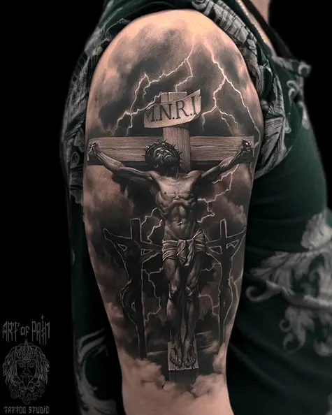 Татуировка мужская реализм на плече Иисус на кресте (Вячеслав Плеханов) 8328