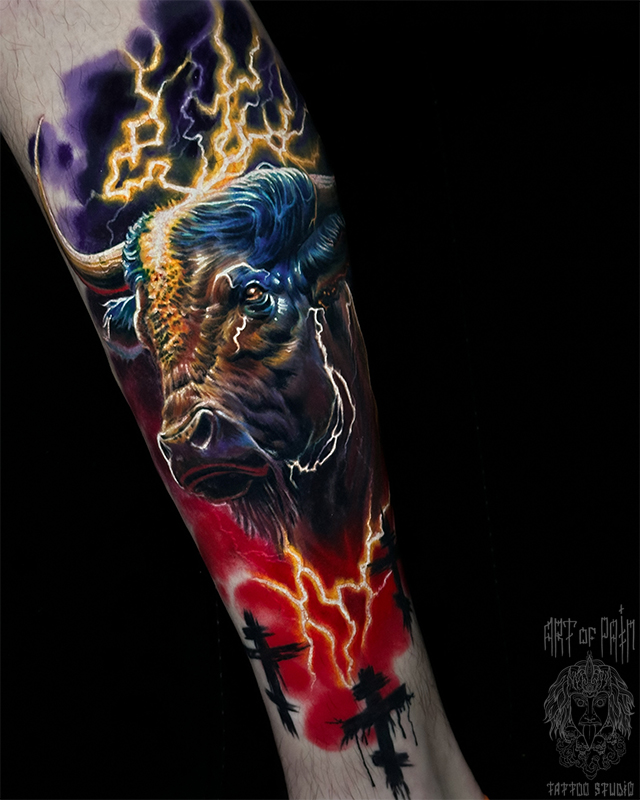Татуировка мужская цветной реализм на предплечье бык (Вячеслав Плеханов) 8400