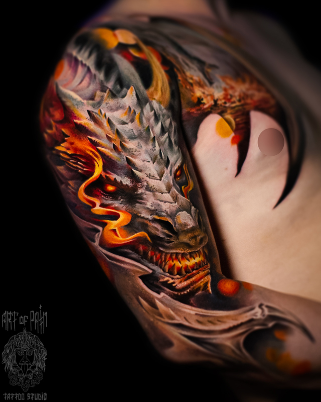 Татуировка мужская цветной реализм на плече дракон (Дмитрий Шейб) 8401