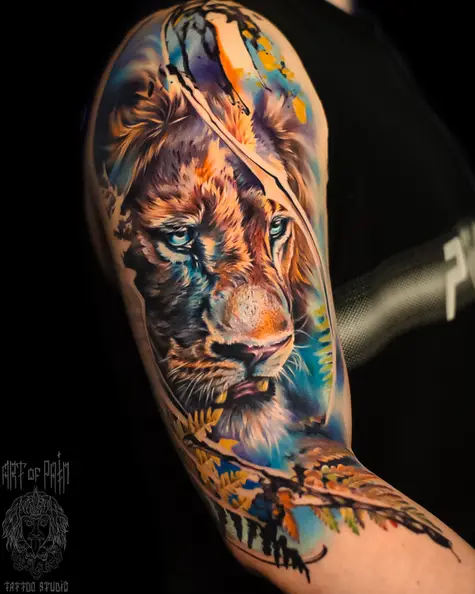 Татуировка мужская цветной реализм на плече лев (Дмитрий Шейб) 8445