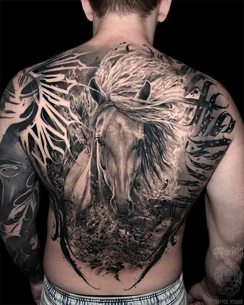 Татуировка мужская реализм на спине конь (Вячеслав Плеханов) 8585