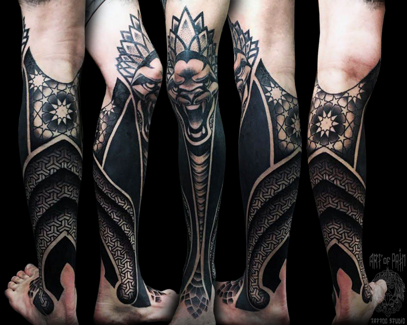 Татуировка мужская орнаментал и графика на голени животное и узор 8594