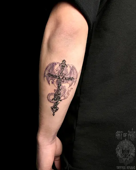 Татуировка мужская графика на предплечье дракон и крест 8597
