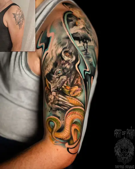 Татуировка мужская цветной реализм на плече медоед (Дмитрий Шейб) 8601