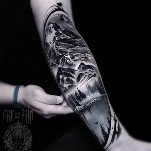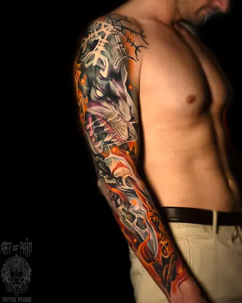 Татуировка мужская реализм тату-рукав птичьи черепа и волки (Дмитрий Шейб) 8645