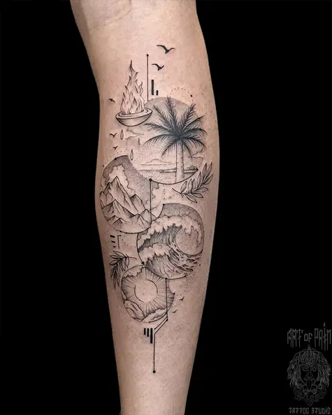 Татуировка мужская графика на голени пейзаж, море (Мария Котова) 8655