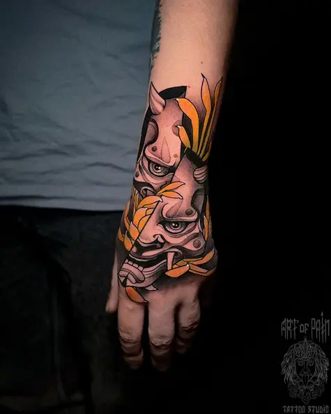 Татуировка мужская япония на кисти маска, демон 8684