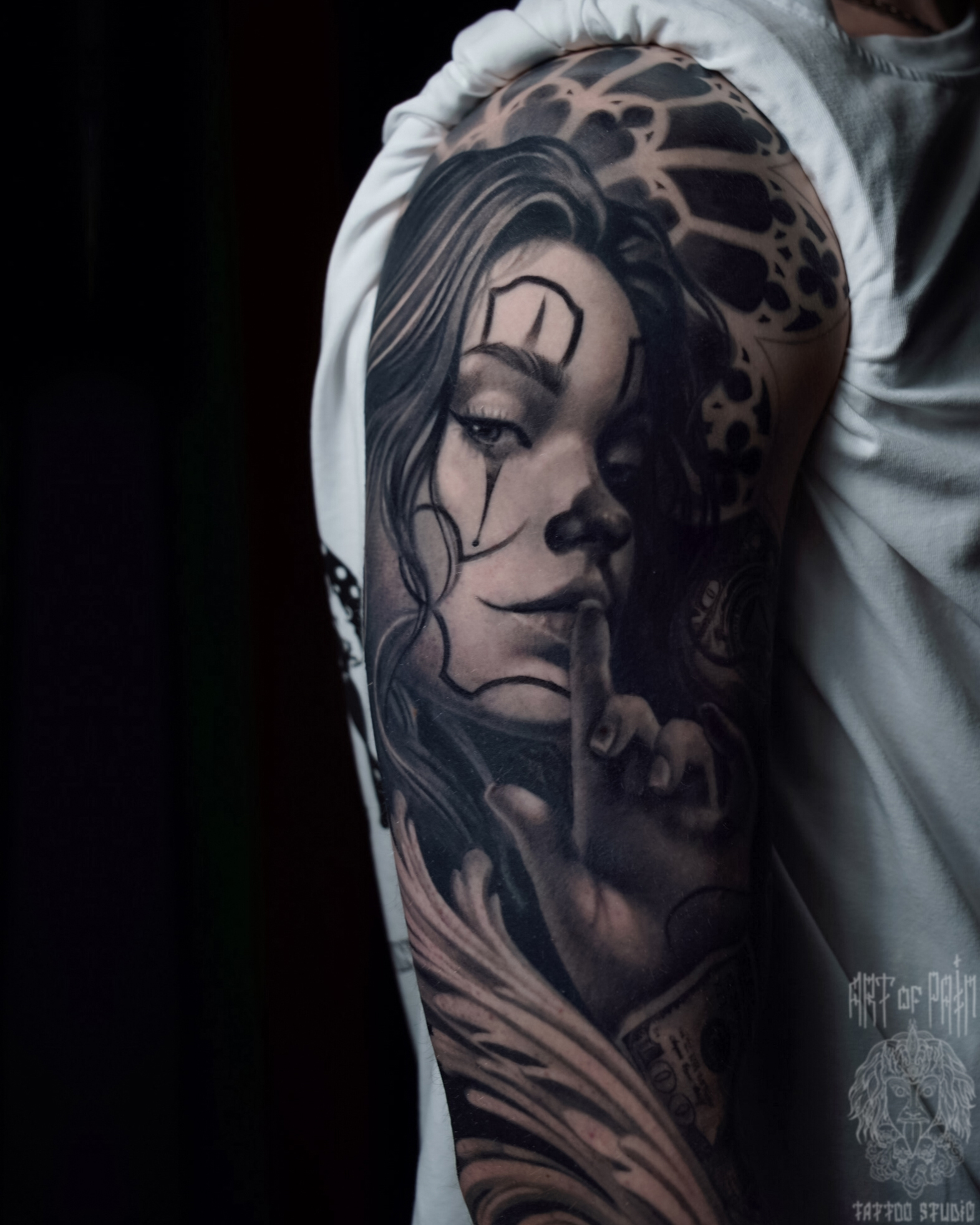 Татуировка мужская чикано и реализм на плече девушка (Анастасия Юсупова) 8742