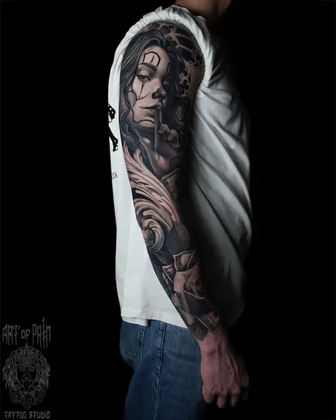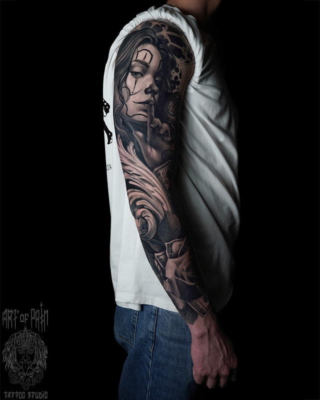 Татуировка мужская чикано и реализм тату-рукав девушки, клоуны (Анастасия Юсупова) 8744