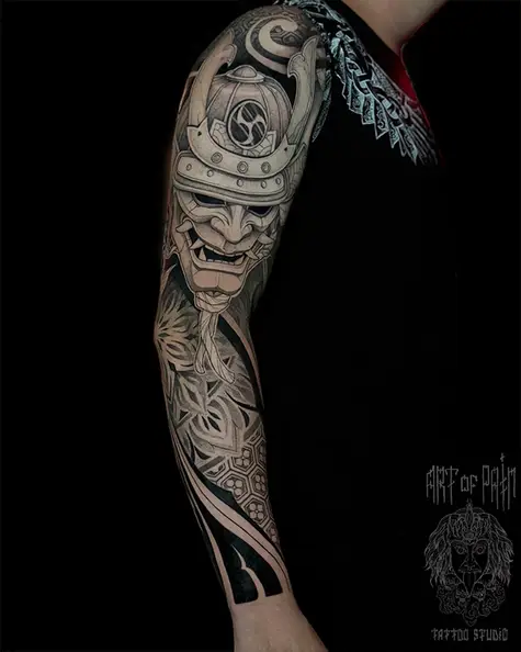 Татуировка мужская япония, графика и орнаментал тату-рукав самурай и узоры (Мария Котова) 8768