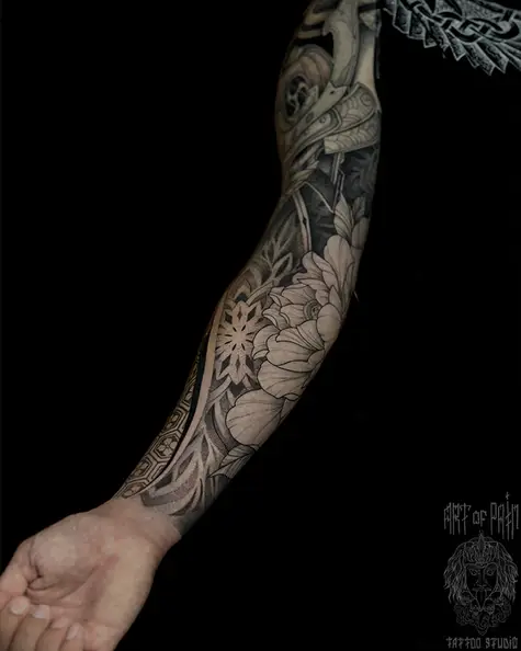 Татуировка мужская япония, графика и орнаментал тату-рукав пион и узоры (Мария Котова) 8770