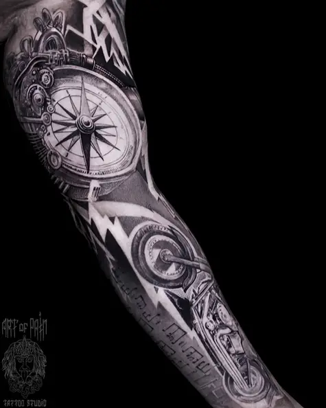 Татуировка мужская реализм тату-рукав компас, мотоцикл (Слава Tech Lunatic) 8794