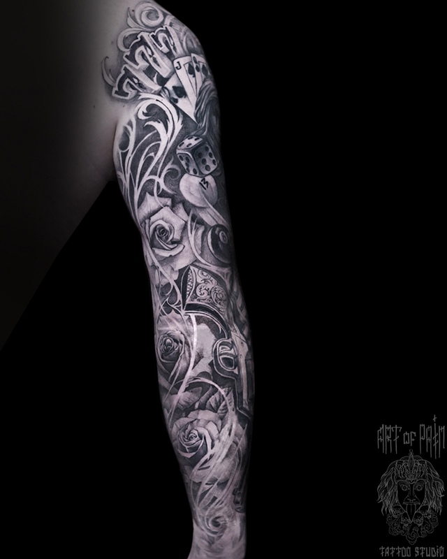 Татуировка мужская чикано тату-рукав карты, револьвер, розы (Слава Tech Lunatic) 8797