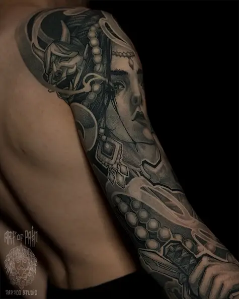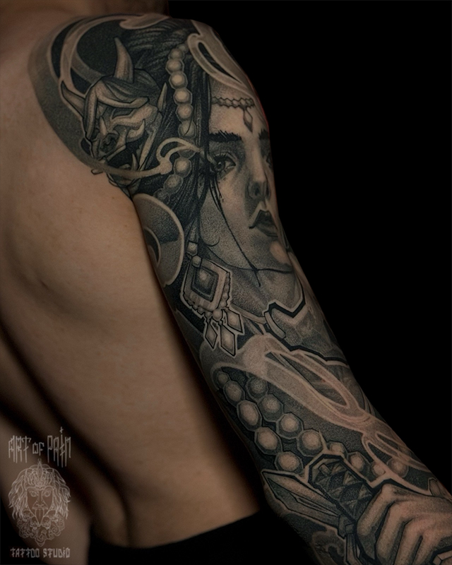 Татуировка мужская нео-япония на плече девушка, маска и меч (Денис Марченко) 8834