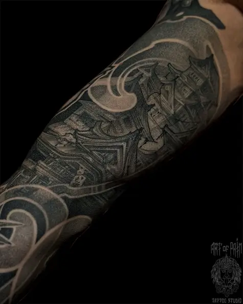 Татуировка мужская нео-япония на руке пагода (Денис Марченко) 8836