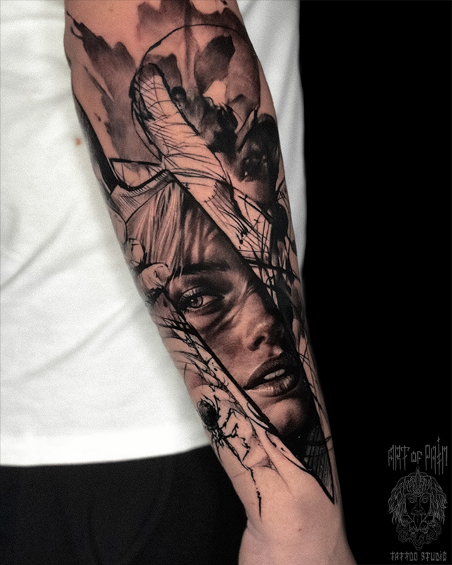 Татуировка мужская реализм на предплечье девушка портрет (Вячеслав Плеханов) 8846
