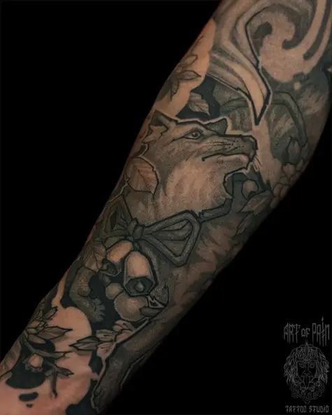 Татуировка мужская нео-япония на предплечье кицунэ и сакура (Денис Марченко) 8879